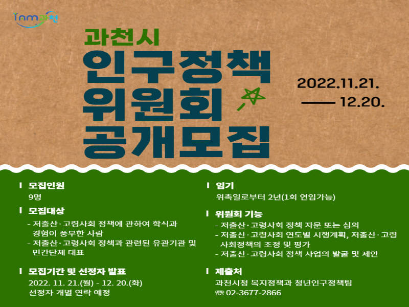 과천시가 저출산·고령사회에 대응하는 시의 정책에 대해 심의와 자문을 하는 ‘과천시 인구정책위원회’를 신설하고, 위촉직 위원 9명을 오는 12월 20일까지 공개 모집한다.