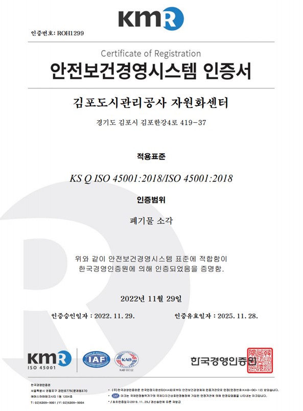 자원화센터는 2019년도 처음으로 안전보건경영시스템 인증을 획득했으며, 갱신 유효기간(3년)을 대비하여 지난 9월부터 인증추진팀을 구성하여 체계적인 관리와 운영을 통한 세부적인 안전보건 프로세스를 구축하고 1·2차 갱신 심사를 통해 2022년 11월 29일 인증을 갱신했다.