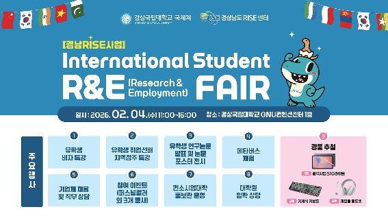 한방통신사 신유철기자 기자 | 경상국립대학교2월 4일 가좌캠퍼스 GNU 컨벤션센터에서 경남 라이즈(RISE) 사업의 일환으로 ‘유학생 전용 연구·취업박람회(International Student R·E(Research · Employment) Fair)’를 개최한다. 이 행사는 외국인 유학생만을 위한 행사로 경남지역 대학 유학생은 모두 참여할 수 있다.
