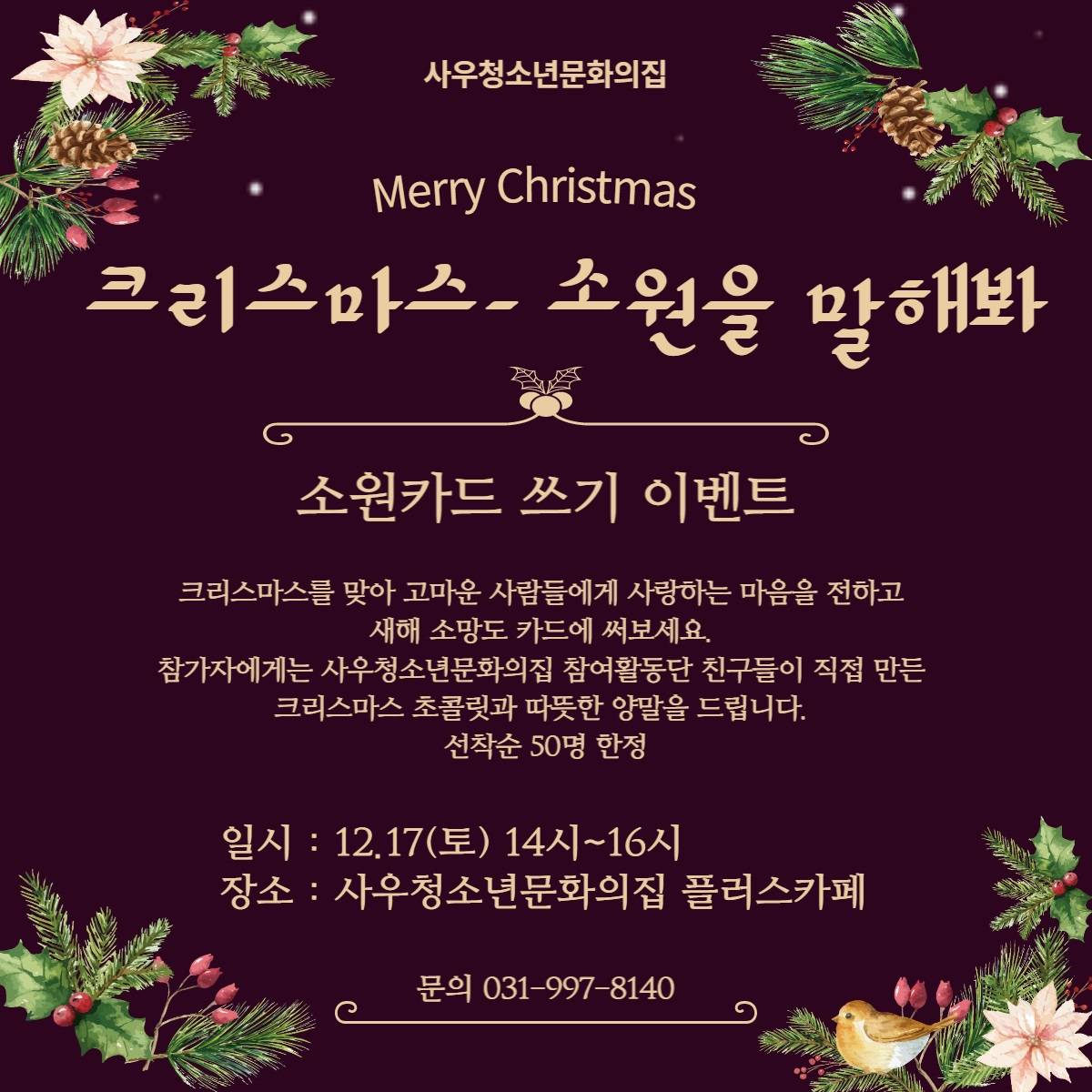 소원 카드 쓰기는 연말연시 가족과 친구에 대한 감사와 사랑의 표현, 새해 소망 등 한 해를 마무리 하며 평소 하고 싶었던 말이나 소망을 카드에 적어 트리에 장식함으로써 청소년에게 지난 한 해를 돌아보고 새해를 다짐하는 기회를 마련하기 위해 기획되었으며 12월 17일 토요일 오후 2시~4시까지 사우청소년문화의집 플러스카페 내에서 진행된다.