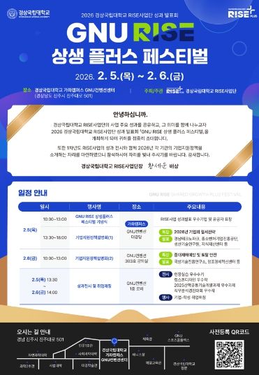 한방통신사 신유철기자 기자 | 경상국립대학교 라이즈(RISE) 사업단(단장 황세운)은 2월 5~6일 가좌캠퍼스 GNU 컨벤션센터 대강당 일원에서 RISE사업의 1차 연도 성과발표회 및 기업지원정책 설명회 ‘GNU RISE 상생 플러스 페스티벌’을 개최한다.