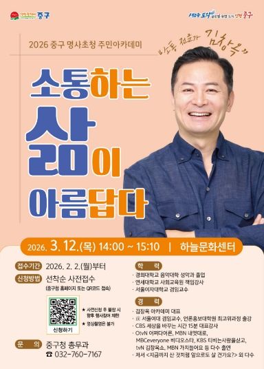한방통신사 신유철기자 기자 | 인천시 중구는 오는 3월 12일 오후 2시 하늘문화센터에서 소통 전문가 김창옥과 함께하는 올해 첫 번째 ‘중구 명사 초청 주민아카데미’를 개최한다고 밝혔다.