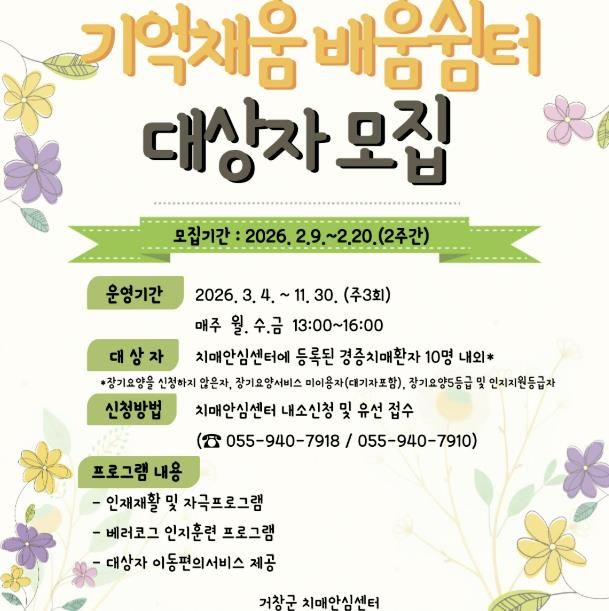 한방통신사 신유철기자 기자 | 거창군치매안심센터는 오는 9일부터 20일까지 경증 치매 환자 중 전문적 인지자극 프로그램과 돌봄을 제공하는 ‘기억채움 배움쉼터’에 참여할 대상자를 모집한다.