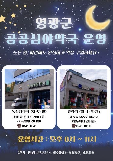 한방통신사 신다은기자 기자 | 영광군은 오는 2월 9일부터 공공심야약국 2개소를 지정하여 매일 오후 8시부터 11시까지 운영한다고 밝혔다.