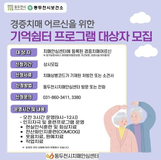 한방통신사 신유철기자 기자 | 동두천시치매안심센터는 경증 치매 환자를 대상으로 ‘기억쉼터 프로그램’ 1기 참여자를 모집한다고 밝혔다. 프로그램은 2026년 3월 9일부터 5월 12일까지 운영된다.