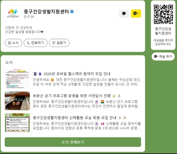 한방통신사 신태공 기자 | 대전 중구는 주민들에게 보다 폭넓고 신속한 건강 정보와 중구건강생활지원센터에서 추진하는 각종 사업 정보를 제공하기 위해 카카오톡 채널을 개설・운영한다고 8일 밝혔다.