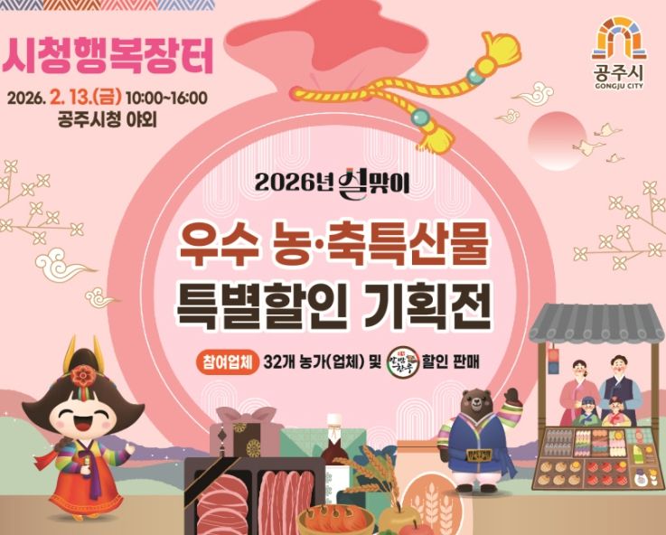 한방통신사 신태공 기자 | 공주시는 다가오는 설 명절을 맞아 오는 2월 13일 오전 10시부터 오후 4시까지 공주시청 광장에서 설맞이 농특산물 직거래 ‘행복장터’를 운영한다고 밝혔다.