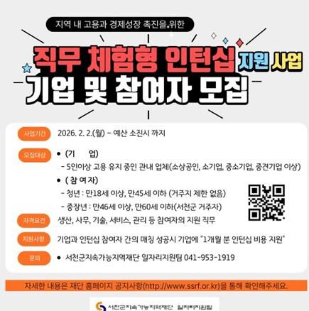 한편, 직무 체험형 인턴십 지원사업과 관련된 자세한 사항은 서천군지속가능지역재단 홈페이지를 통해 확인할 수 있다.
