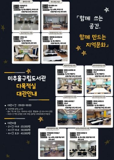 한방통신사 신유철기자 기자 | 인천 미추홀구가 주민들의 문화 활동과 커뮤니티 활성화를 위해 구립도서관 다목적실 대관 운영을 확대한다.