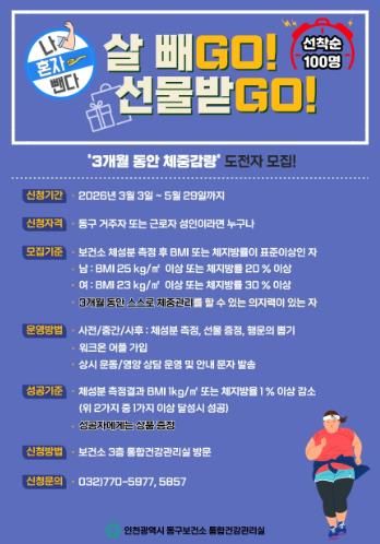 한방통신사 신유철기자 기자 | 인천 동구보건소는 주민 스스로 건강한 체중 관리를 할 수 있도록 돕는‘나 혼자 뺀다! 살빼GO! 선물받GO!’프로그램 참여자를 모집한다고 밝혔다.
