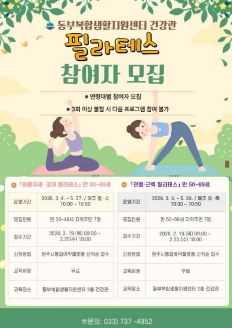 한방통신사 양호선기자 기자 | 원주시 동부복합생활지원센터 건강관은 오는 19일부터 중·장년을 대상으로 한 필라테스 프로그램 참여자를 모집한다.
