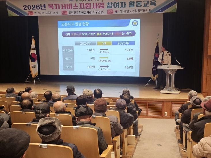 한방통신사 신태공 기자 | (사)대한노인회 청양군지회(지회장 전석호)는 지난 6일, 복지서비스 지원사업 참여자 150명을 대상으로 청양경찰서와 연계한 ‘2026년 노인 일자리 참여자 교통안전교육’을 실시했다.