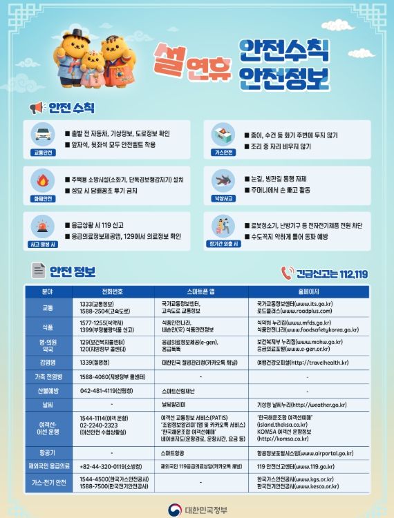 정부는 ▴주요 취약 분야 안전 점검 ▴연휴 기간 24시간 상황관리 ▴안전정보·수칙 대국민 홍보에 중점을 두고 설 명절 국민 피해와 불편을 최소화하는 데 총력을 다할 방침이다.