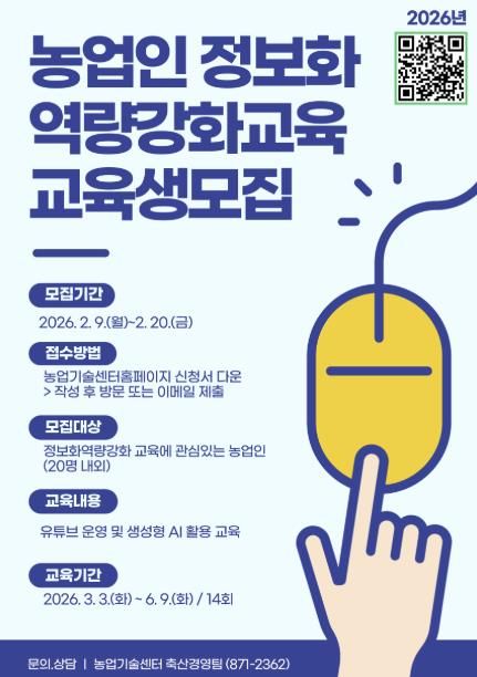 한방통신사 권영분기자 기자 | 음성군농업기술센터는 농업인의 디지털 활용 능력과 온라인 홍보 역량 강화를 위해 ‘2026년 농업인 정보화 역량강화교육’ 교육생을 모집한다.