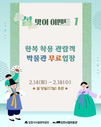 한방통신사 신유철기자 기자 | 김천시시설관리공단(이사장 김재광)은 2026년 설 명절을 맞아 감문국이야기나라와 김천시립박물관을 중심으로 가족 단위 관람객이 함께 즐길 수 있는 ‘설맞이 문화 행사’를 운영한다. 이번 행사는 2월 14일부터 2월 18일까지 진행된다.