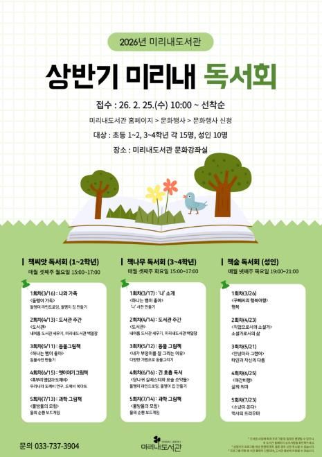 이번 독서회는 ▲책씨앗 독서회(초등 1·2학년) ▲책나무 독서회(초등 3·4학년) ▲책숲 독서회(성인) 등 3개 강좌로 운영된다. 월별 선정도서를 바탕으로 전문 강사와 함께하는 독서 토론 등 다양한 독서 활동이 매월 1회 진행될 예정이다.