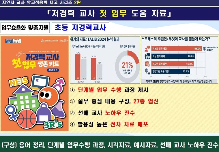 이번 자료는 지난 ‘새내기 교사 첫 출근 도움 자료’에 이어 교사의 학교 적응력을 높이기 위한 두 번째 시리즈로, 학교 현장에서 저경력 교사들이 주로 담당하게 되는 핵심 업무 27종을 엄선하여 수록했다.