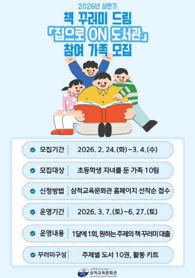 한방통신사 신유철기자 기자 | 삼척교육문화관은 3월부터 6월까지 가족 단위 독서 문화를 장려하기 위하여 초등학생 자녀를 둔 가족을 대상으로 책 꾸러미 드림 ‘집으로 온(ON) 도서관’을 운영한다.