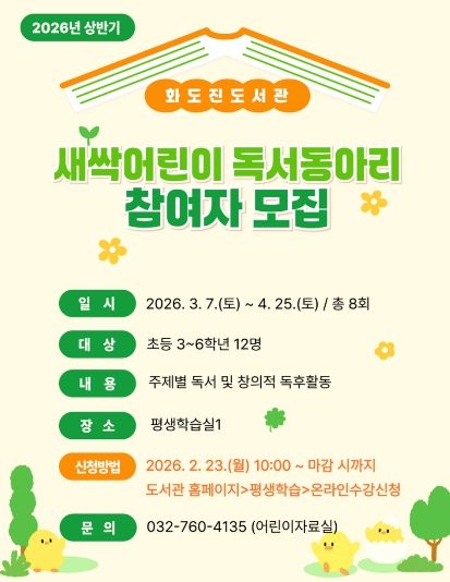 한방통신사 신유철기자 기자 | 인천광역시교육청화도진도서관은 23일부터 초등 3~6학년 학생을 대상으로, 기초 문해력과 자기주도적 독서 습관 강화를 위한 ‘2026년 새싹어린이 독서동아리’ 참여자를 모집한다.