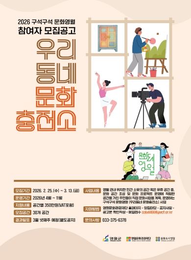 한방통신사 양호선기자 기자 | (재)영월문화관광재단은 영월 문화도시 사업의 일환으로 구석구석 문화영월 '우리동네 문화충전소' 참여 공간을 모집한다.