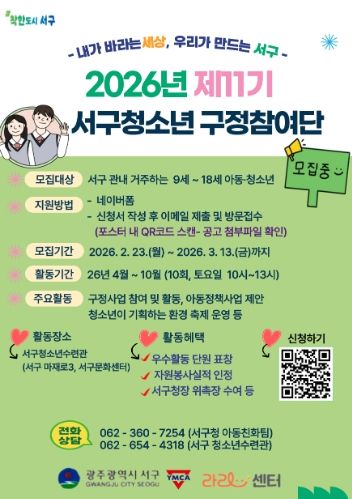 서구는 3월13일까지 서구에 거주하거나 관내 학교에 재학 중인 9세부터 18세까지 아동·청소년 80명을 모집한다. 참여를 희망할 경우 서구청소년수련관 누리집의 관련 서류를 준비해 서구청 양성아동복지과에 방문하거나 전자우편으로 제출하면 된다. 네이버폼으로도 신청 가능하다.