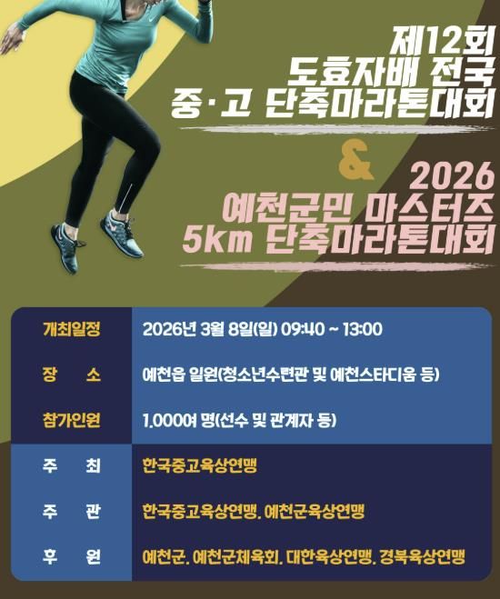 한방통신사 신유철기자 기자 | 예천군은 오는 8일 오전 10시부터 예천읍 일원에서 '제12회 예천 도효자배 전국 중·고 단축마라톤대회' 및 '2026 예천군민 마스터즈 단축마라톤대회'를 개최한다고 밝혔다.