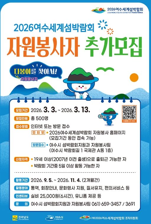 한방통신사 신다은기자 기자 | 여수시가 2026여수세계섬박람회의 성공적인 개최를 위해 박람회의 주역이 될 자원봉사자, 공식 애칭 ‘다봉이’ 추가 모집에 나선다.
