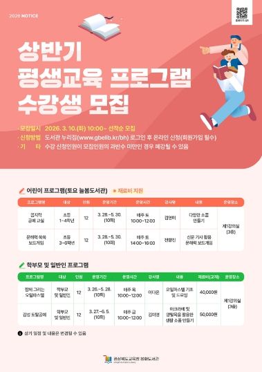 한방통신사 신유철기자 기자 | 경상북도교육청 봉화도서관(관장 이영숙)은 지역 주민의 평생학습 기회를 넓히기 위해 상반기 평생교육 및 토요 늘봄도서관 프로그램 수강생을 모집한다.