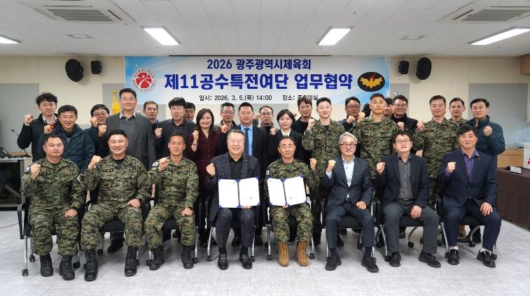 한방통신사 김성의 기자 | 광주광역시체육회(회장 전갑수)는 5일 14시 체육회관 2층 중회의실에서 육군특수전사령부 황금박쥐부대(여단장 조웅)과 업무협약을 체결했다고 밝혔다.