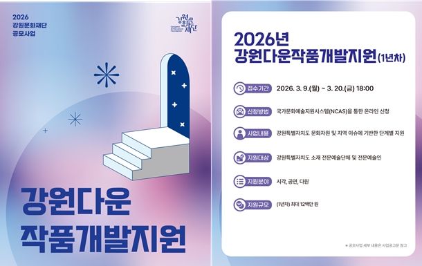 한방통신사 신유철기자 기자 | 강원문화재단은 강원을 대표할 창작 콘텐츠 발굴을 위해 '2026 강원다운작품개발지원사업(1년차)' 공모 접수를 9일부터 시작한다.