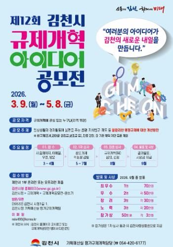 한방통신사 신유철기자 기자 | 김천시는 시민의 아이디어를 바탕으로 일상생활과 기업활동 과정에서 발생하는 불합리한 규제를 개선하기 위해 제12회 규제개혁 아이디어 공모전을 개최한다.