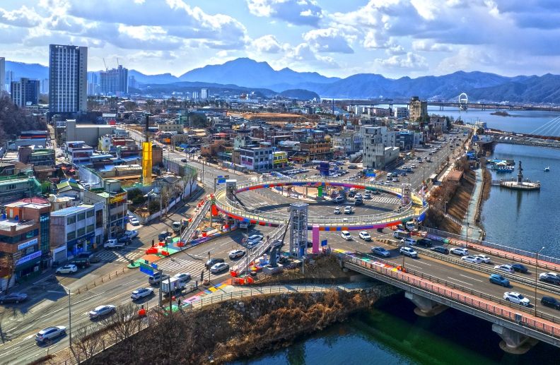 소양아트서클은 호반사거리에 조성된 원형 구조의 보행 시설로 단순히 건너가는 육교를 넘어 걷는 순간 완성되는 공공예술이자 도심 체험 공간으로 기획됐다.