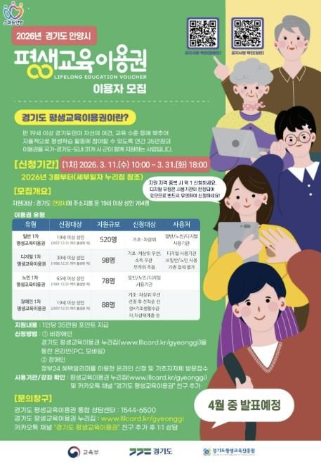 한방통신사 신유철기자 기자 | 안양시는 저소득층, 어르신, 장애인 등 교육 취약계층의 평생학습 기회를 보장하기 위한 총 3억 원 규모의 ‘2026년 평생교육 이용권(바우처) 지원사업’을 추진한다고 11일 밝혔다.