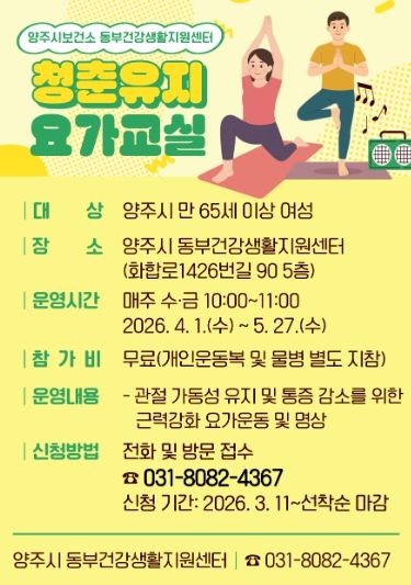 ‘청춘유지 요가교실’은 만 65세 이상 양주시 여성을 대상으로 하며, 참여 신청은 3월 11일부터 전화 또는 방문을 통해 접수할 수 있다.