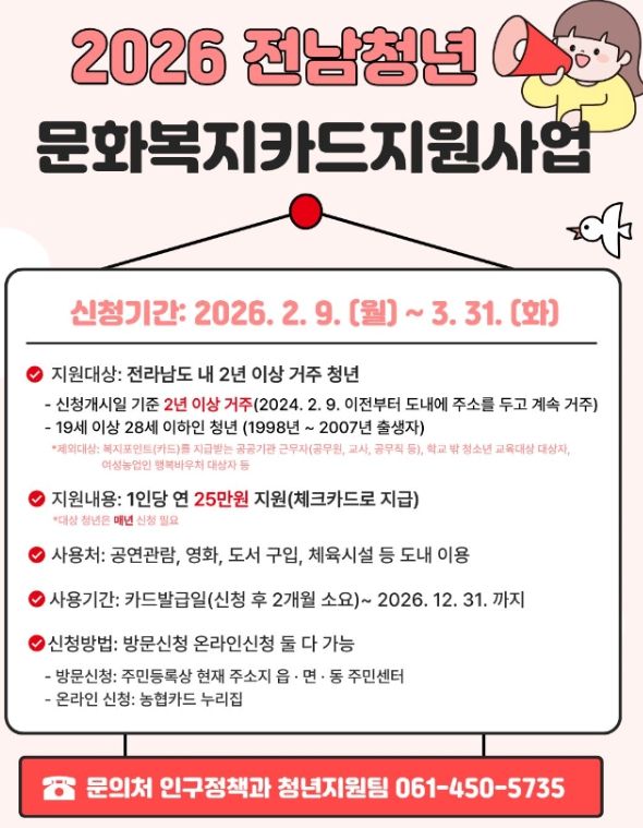한방통신사 신다은기자 기자 | 무안군은 청년의 문화생활과 자기계발을 지원하기 위해 ‘2026년 전남 청년 문화복지카드 지원사업’ 대상자를 모집하고 있다고 밝혔다.