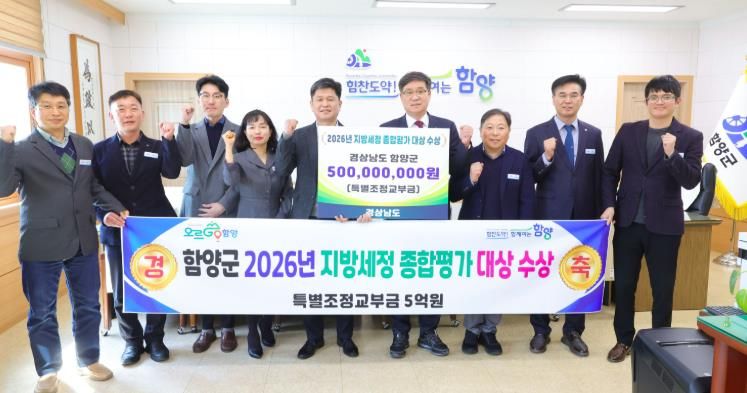 한방통신사 신유철기자 기자 | 함양군이 경상남도가 주관한 ‘2026(2025년 실적) 지방세정 종합평가’에서 최고 등급인 대상을 받아 상사업비 5억 원과 도지사 기관 표창을 받는 쾌거를 이뤘다.