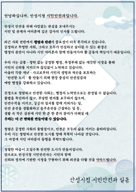 한방통신사 신유철기자 기자 | 안성시는 각종 안전점검 과정에서 청렴 안내문을 배부하는 ‘청렴한 안전점검’을 추진하며 시민 청렴의식 제고에 나선다.