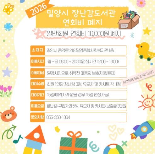 밀양시는 이 같은 내용을 담은 ‘밀양시 장난감도서관 설치·운영 조례’ 일부 개정안을 공포하고, 3월 26일부터 본격 시행한다고 밝혔다.