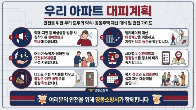 이번 홍보는 공동주택의 구조적 특성을 고려해 비상상황 발생 시 주민들이 보다 신속하고 안전하게 대피할 수 있도록 행동 중심의 안전수칙을 안내하는 데 목적이 있다.