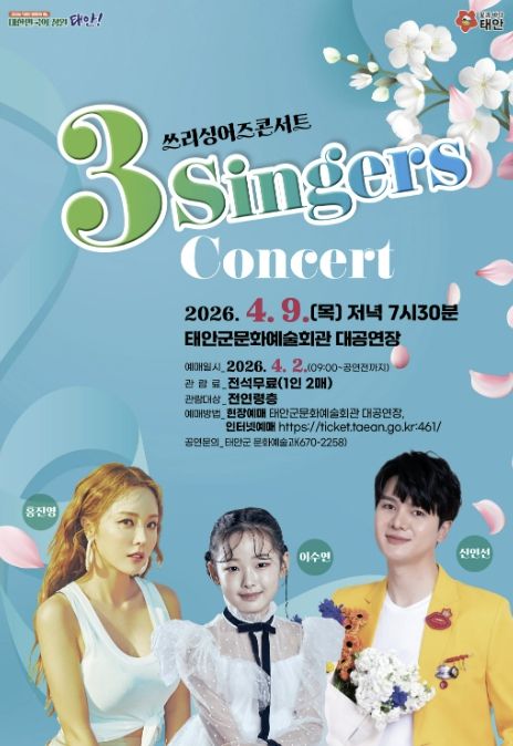 한방통신사 신태공 기자 | 태안군이 4월 9일 태안군문화예술회관 대공연장에서 홍진영 등 유명 가수가 출연하는 ‘3-Singers 콘서트’를 개최한다.