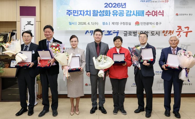 한방통신사 신유철기자 기자 | 인천시 중구는 ‘통합 1기 주민자치회’ 초기부터 현재까지 중구 주민자치 활성화에 헌신해 온 중구 주민자치협의회 소속 임원과 각 동 주민자치회장 등 총 8명을 대상으로 ‘감사패’를 수여했다고 3일 밝혔다.