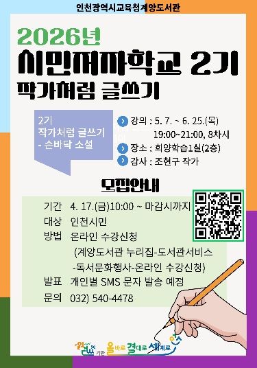한방통신사 신유철기자 기자 | 인천광역시교육청계양도서관은 시민의 글쓰기 역량강화와 창작 경험 지원을 위해, 2026년 시민저자학교 2기 ‘작가처럼 글쓰기-손바닥 소설’ 프로그램을 운영한다.