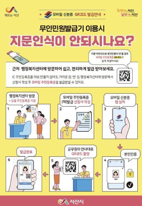 조진희 서산시 민원봉사과장은 “지문인식이 어려운 이용자들은 모바일 신분증 QR코드 인증 방식을 적극 활용해 보다 편리하게 민원 서비스를 이용하시길 바란다”라고 말했다.