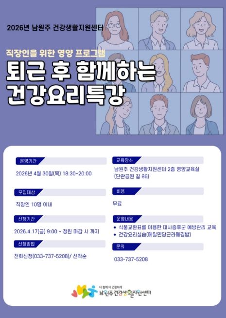 한방통신사 양호선기자 기자 | 남원주건강생활지원센터는 직장인을 위한 영양 프로그램 ‘퇴근 후 함께하는 건강요리특강’ 참여자를 모집한다.