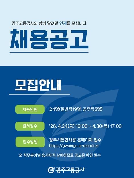자세한 내용은 광주교통공사 홈페이지 ‘채용공고’에서 확인하거나 총무팀으로 문의하면 된다.
