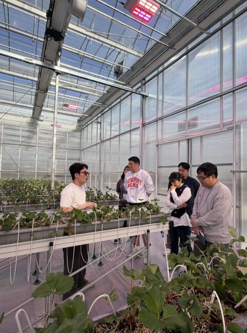이어 실습 교육은 토마토, 딸기, 엽채 분야로 나눠 1조당 6명씩 조를 편성해 로테이션 방식으로 진행했다. 교육생들은 작목별 재배 환경과 관리 방법의 차이를 직접 확인하며 스마트팜 운영의 기초를 익혔다.