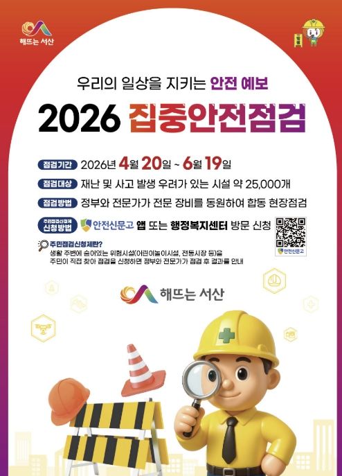 한방통신사 신태공 기자 | 충남 서산시는 4월 20일부터 6월 19일까지 ‘2026년 집중안전점검’을 진행한다고 밝혔다.
