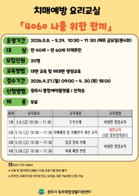 한방통신사 양호선기자 기자 | 원주시 동부복합생활지원센터는 오는 27일부터 치매 예방을 위한 요리교실 ‘4060 나를 위한 한끼’ 참여자를 모집한다.