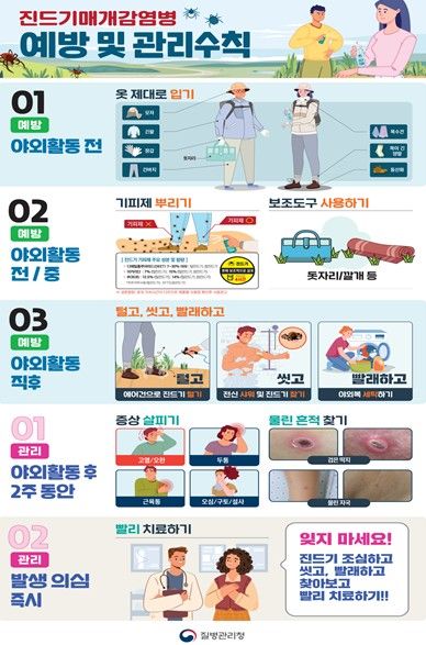 진드기 매개 감염병은 바이러스나 세균에 감염된 일부 진드기에 물려 감염되며, 진드기에 의한 감염병의 종류로는 쯔쯔가무시증, 중증열성혈소판감소증후군(SFTS), 라임병 등이 있다. 주로 농작업·등산·벌초·산책 등 야외 활동 중에 노출될 수 있으며 감염 시 38도 이상의 고열과 오심, 구토, 설사 등 위장관계 증상이 나타난다. 증상이 심해질 경우 출혈성 소인과 다발성 장기부전으로 이어져 사망에 이를 수 있다.