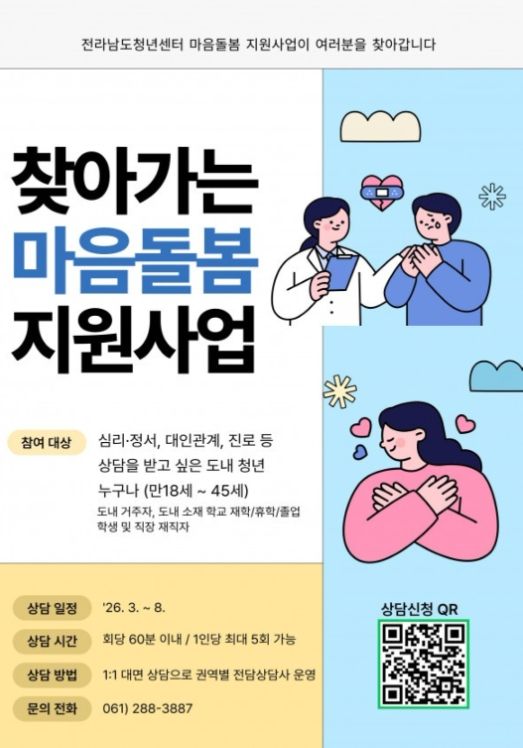 한방통신사 신다은기자 기자 | 전라남도가 지역 청년의 심리적·정서적 안정과 건강한 사회참여를 지원하기 위해 ‘2026년 청년 마음치유 프로그램’을 시범 추진한다.